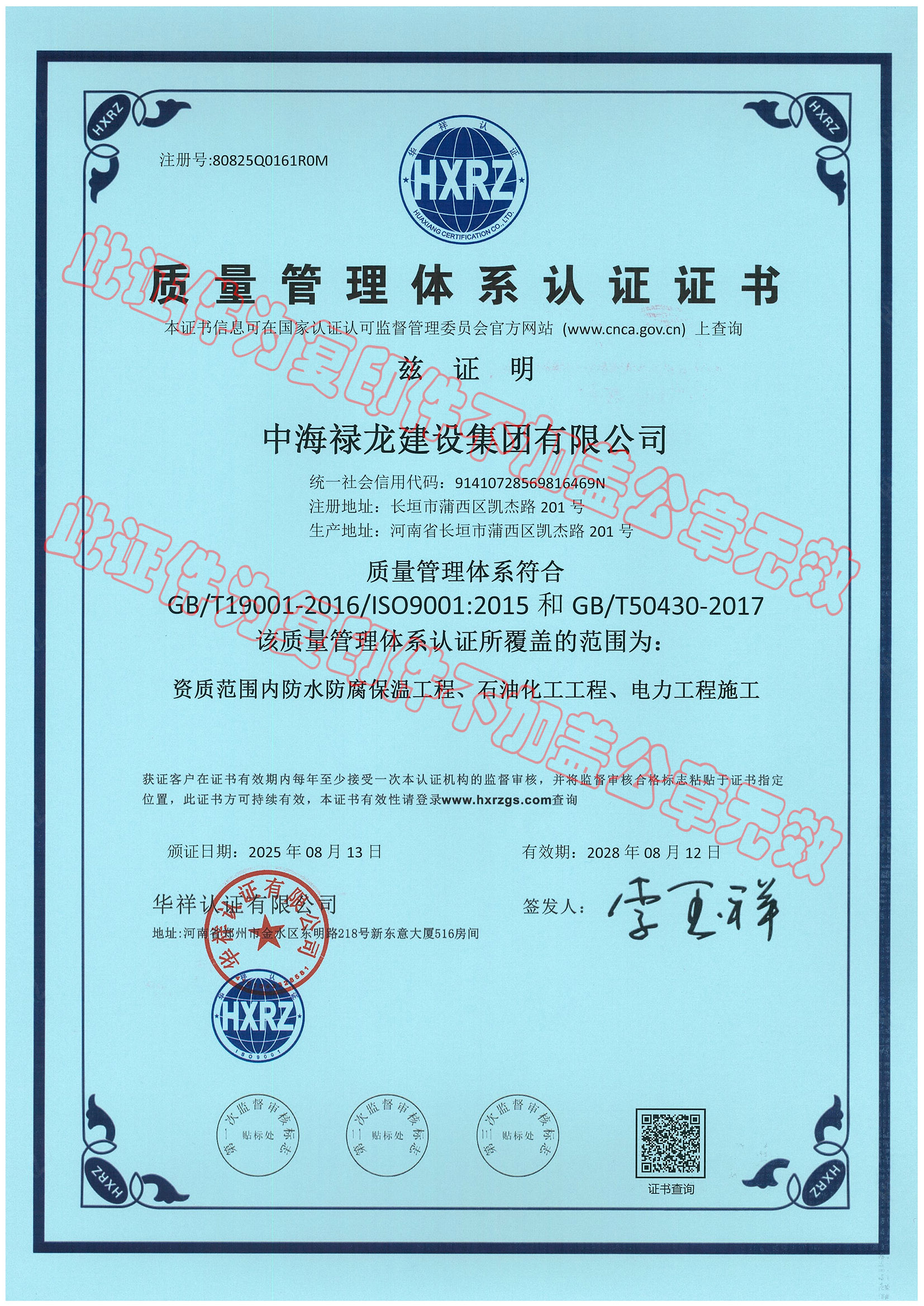 质量管理体系认证证书